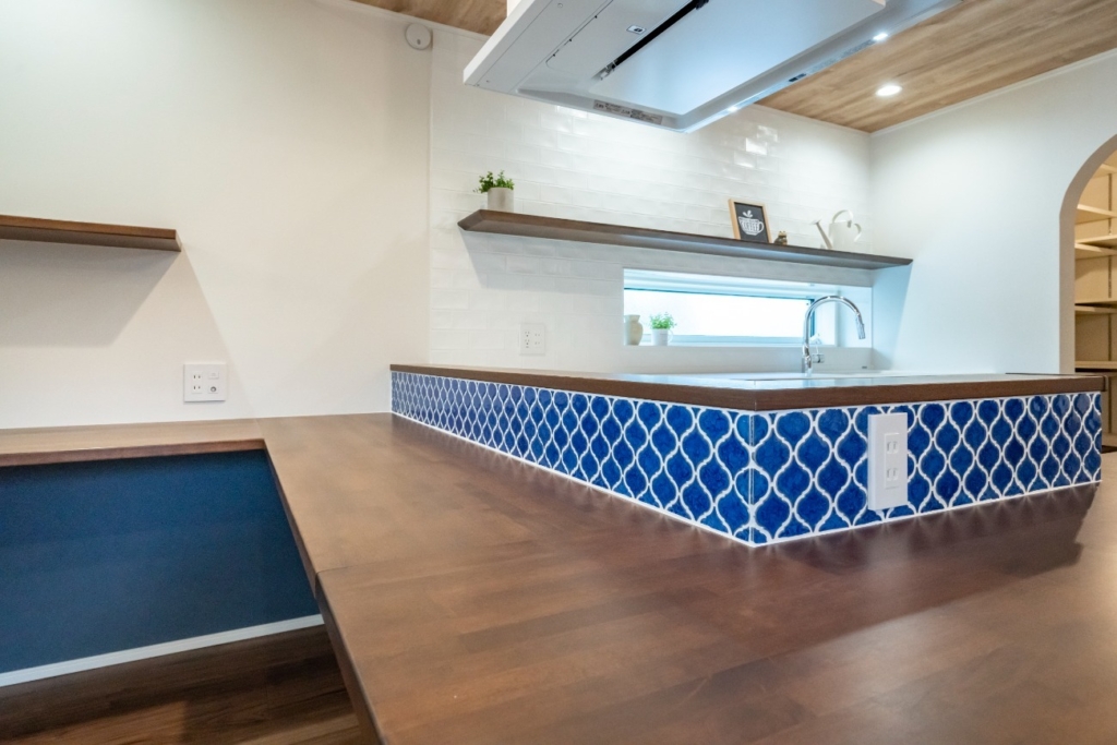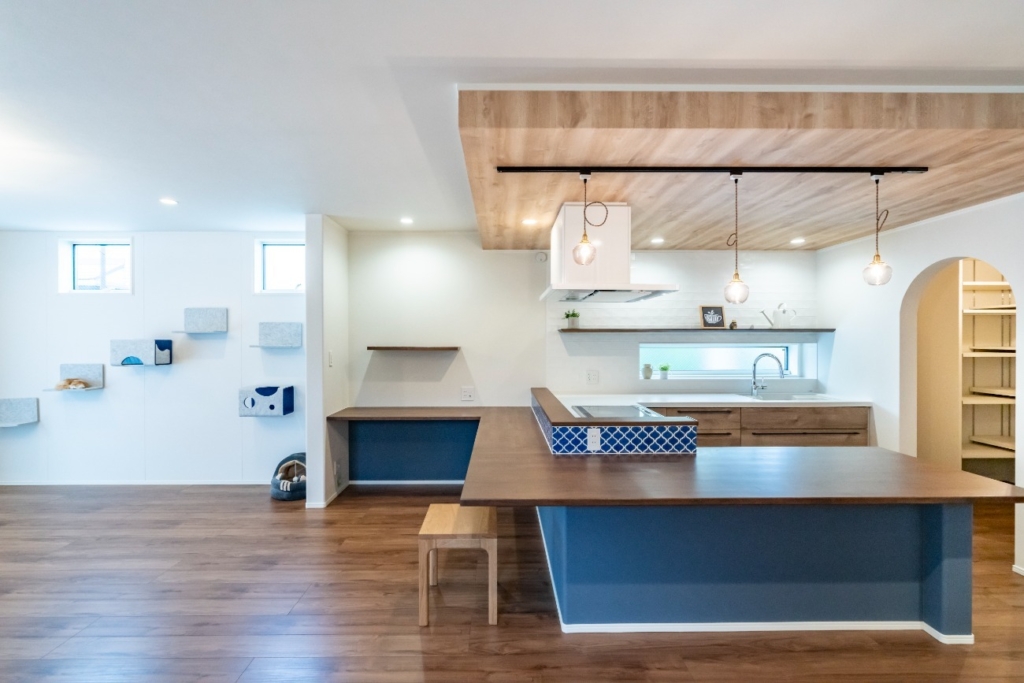 カウンターの立ち上がりや足元にブルーを取り入れることで、LDKの空間をさりげなく彩るコックピットキッチン。使いやすさを考えて、コンセントもしっかりおつけしています。