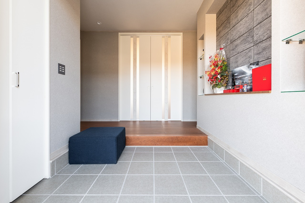玄関タイルのサイズを大判にすると、視線が広がり玄関が広く見えます。