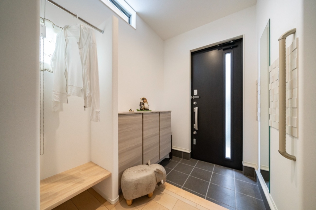 上の写真のオーナー様邸は、玄関にコートなどを収納する場所が欲しいというご要望で玄関ホールにハンガーパイプを計画。帰宅後にさっと片付けられる住まいとなりました。