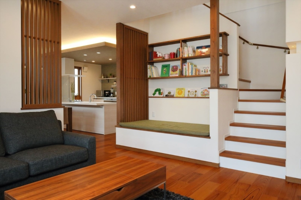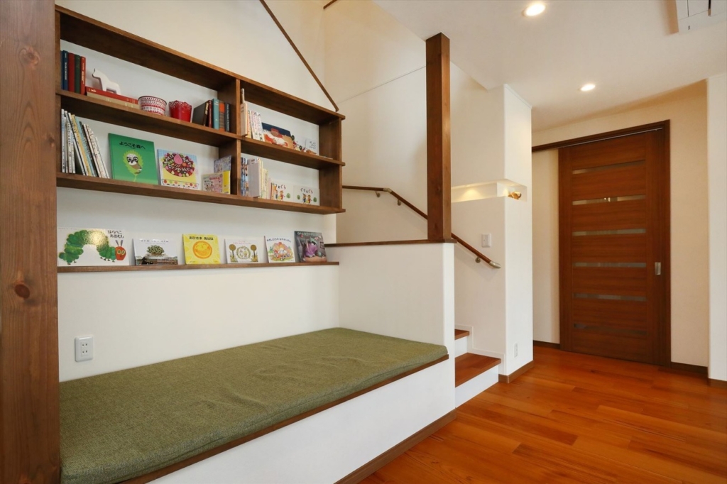 リビングの横に畳1枚分くらいの広さのヌックを作っているのは、クレバリーホーム豊田秋葉展示場のモデルハウス。お子さまがゴロゴロしながら絵本を読むのにぴったりのスペースです。
